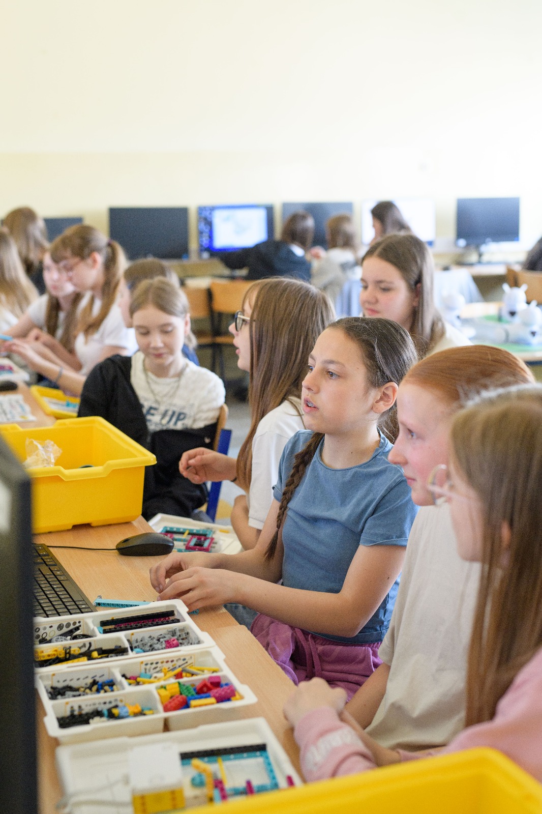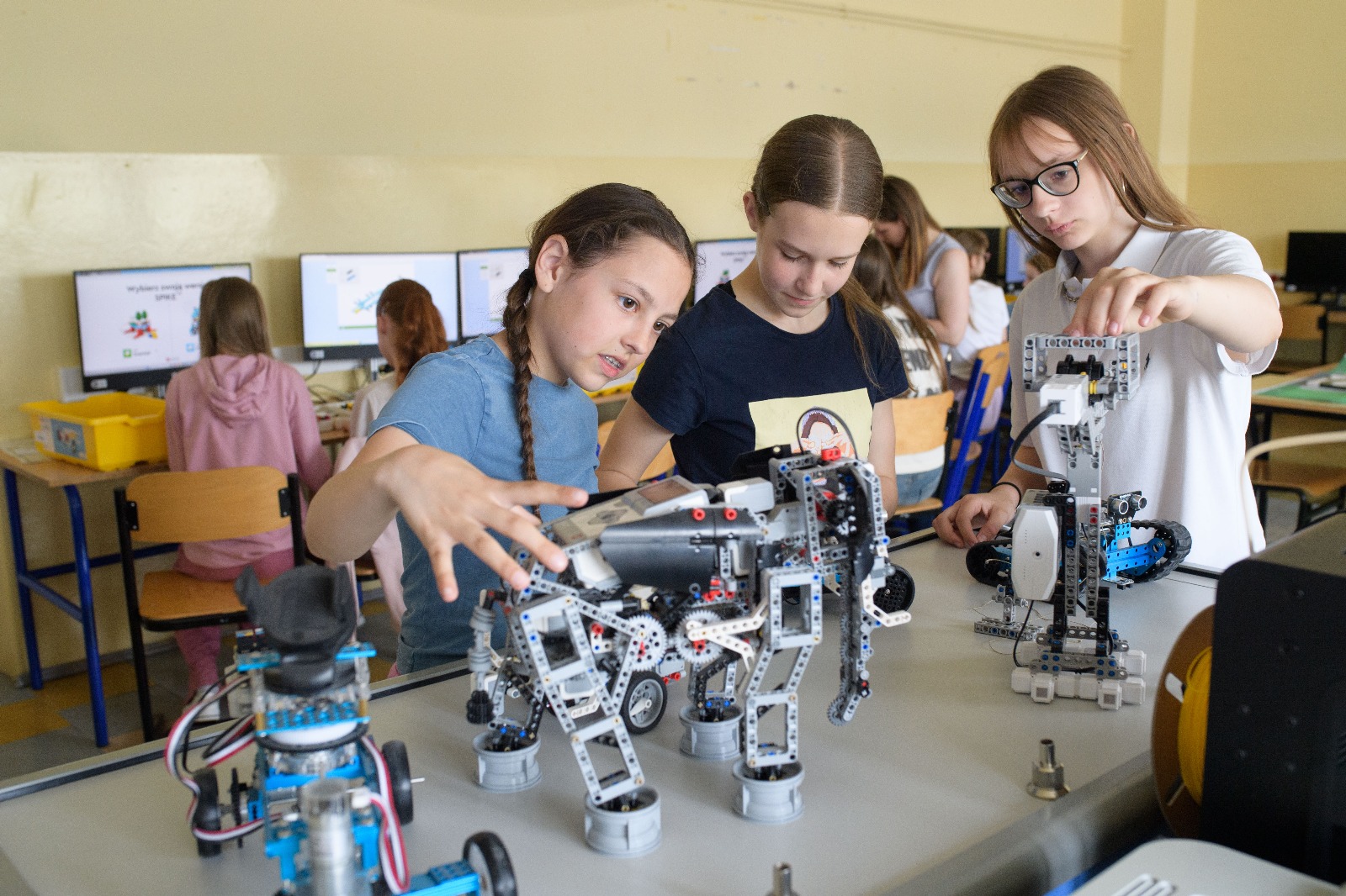 Najmłodsi uczniowie z klas I–III uczyli się poprzez zabawę – uczestniczyli w warsztatach z języka angielskiego oraz w zajęciach z robotyki, gdzie konstruowali i programowali proste roboty. Dzięki temu poznawali świat technologii w przystępny i angażujący sposób.