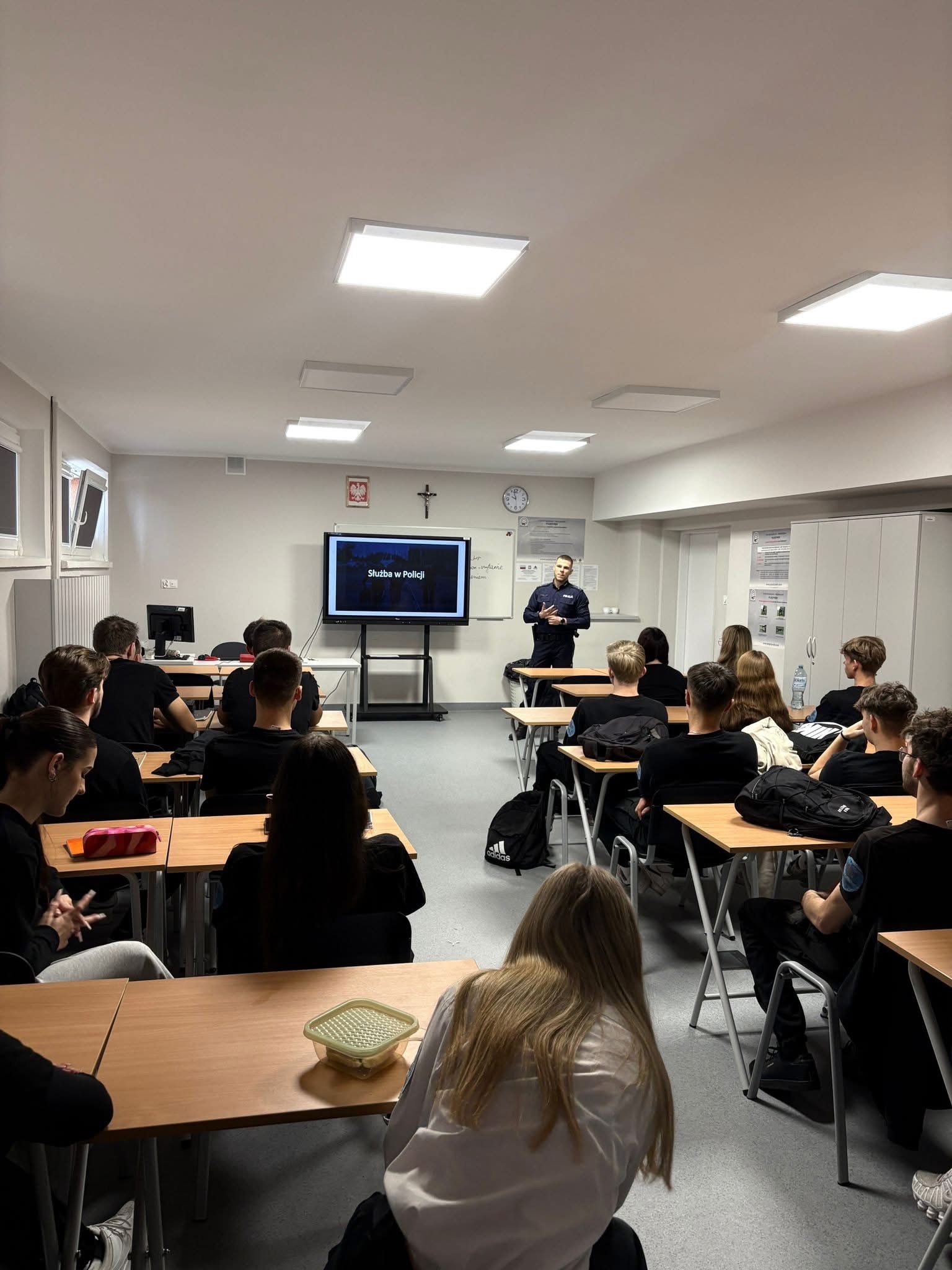 DziÅ› uczniowie klas IV o profilu policyjnym mieli wyjÄ…tkowÄ… okazjÄ™ uczestniczyć w spotkaniu z mÅ‚odszym aspirantem PawÅ‚em Klinkoszem z Komendy Powiatowej Policji w Kartuzach . Nasz gość w niezwykle ciekawy i przystÄ™pny sposób przedstawiÅ‚ procedurÄ™ rekrutacyjnÄ… do sÅ‚użby w Policji – od zÅ‚ożenia dokumentów, przez test wiedzy, sprawnoÅ›ci fizycznej, aż po rozmowÄ™ kwalifikacyjnÄ… i badania psychologiczne.