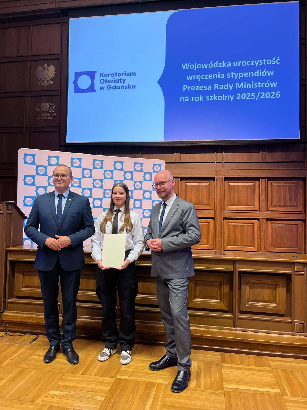 Dnia 24.11.2025r. uczennica naszej szkoły, Martyna Mielewczyk, po raz kolejny, odebrała Stypendium Prezesa Rady Ministrów. Uroczystości wręczania stypendiów odbyły się w gmachu Politechniki Gdańskiej.